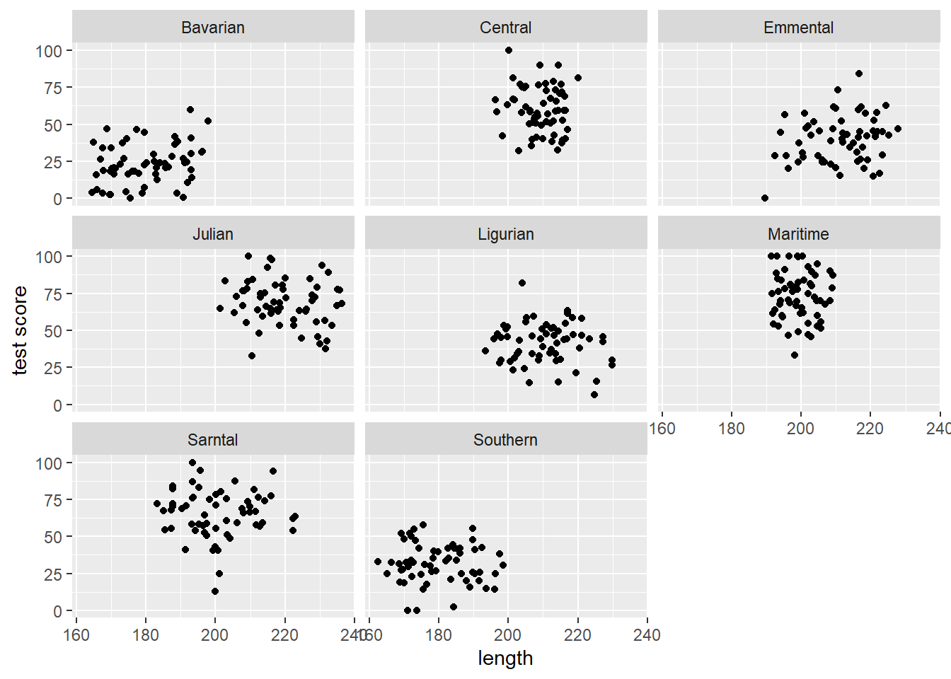 (split_plot <-ggplot(aes(bodyLength, testScore), data = dragons) +geom_point() +facet_wrap(~ mountainRange) +# create a facet for each mountain rangexlab("length") +ylab("test score"))