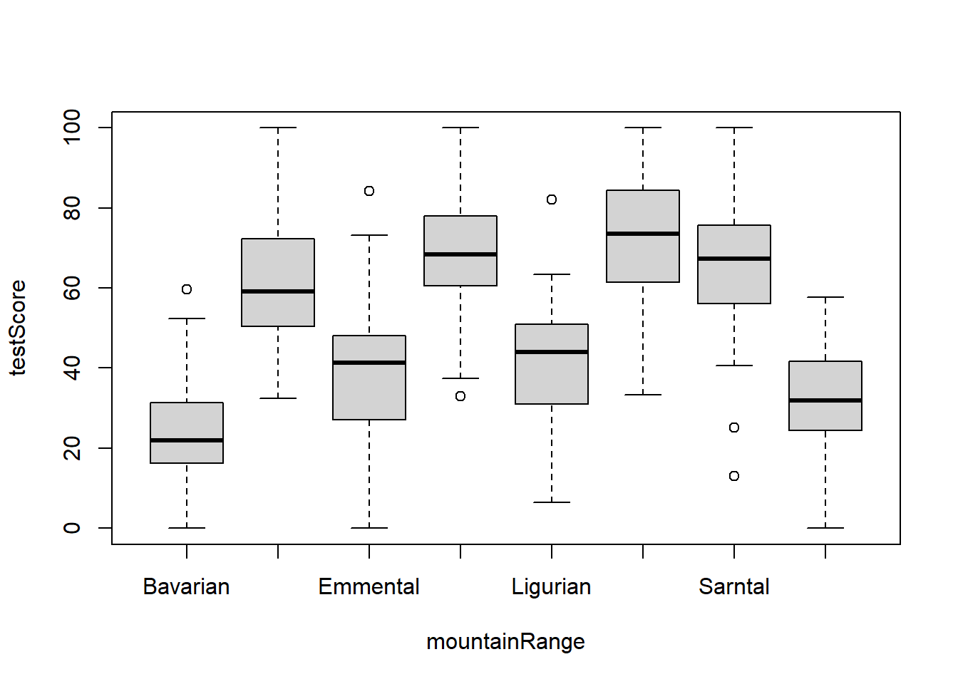 boxplot(testScore ~ mountainRange, data = dragons) # Looks like something is going on here. The median test score for different mountain ranges is different.