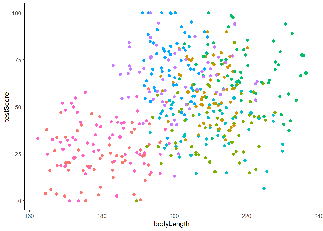 Imagine we went to eight mountain ranges (mountainRange) and collected data on the intelligence (testScore) and size (bodyLength) of 480 dragons. We want to know if size affects their intelligence since we want intelligent dragons that we can train but that aren’t too big and scary!