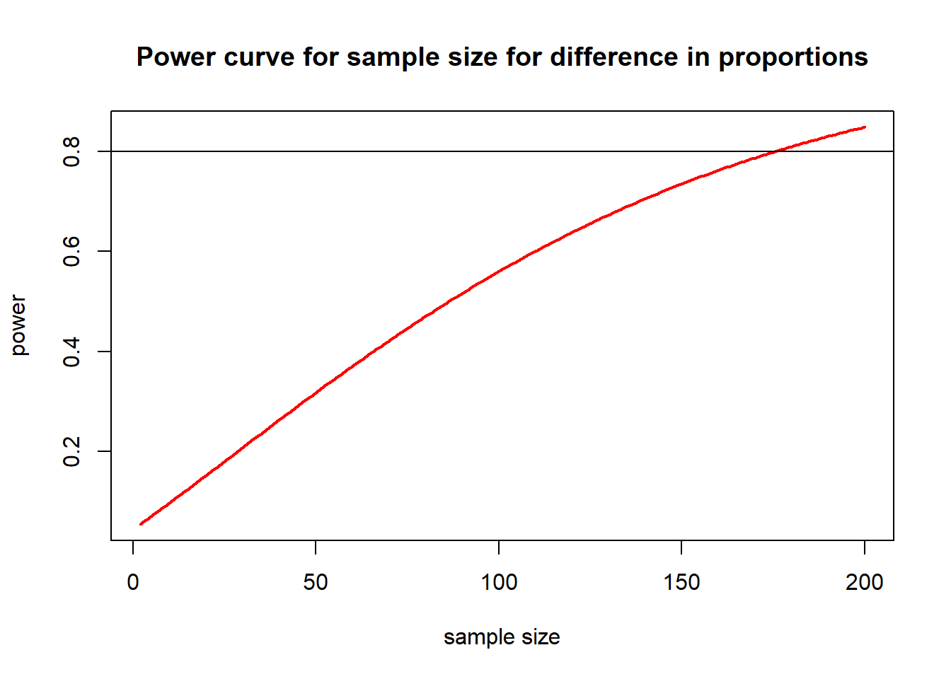 Now we can see that a sample size of around 175 for each group would have given enough power.