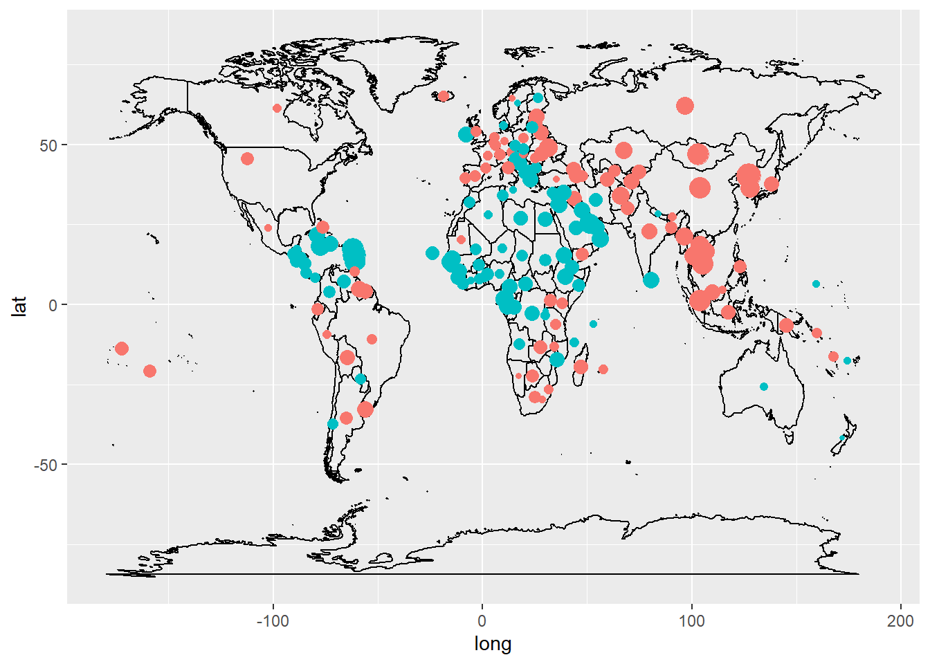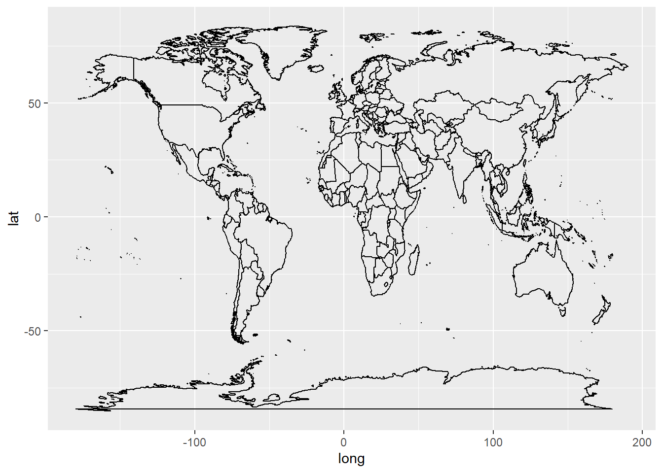 Install and library load the package ggplot2 and ggmap containing the world dataset which is the coordinates of a simple world map. Then pass the world dataset through the map_data function and assign it as an object that you call world.