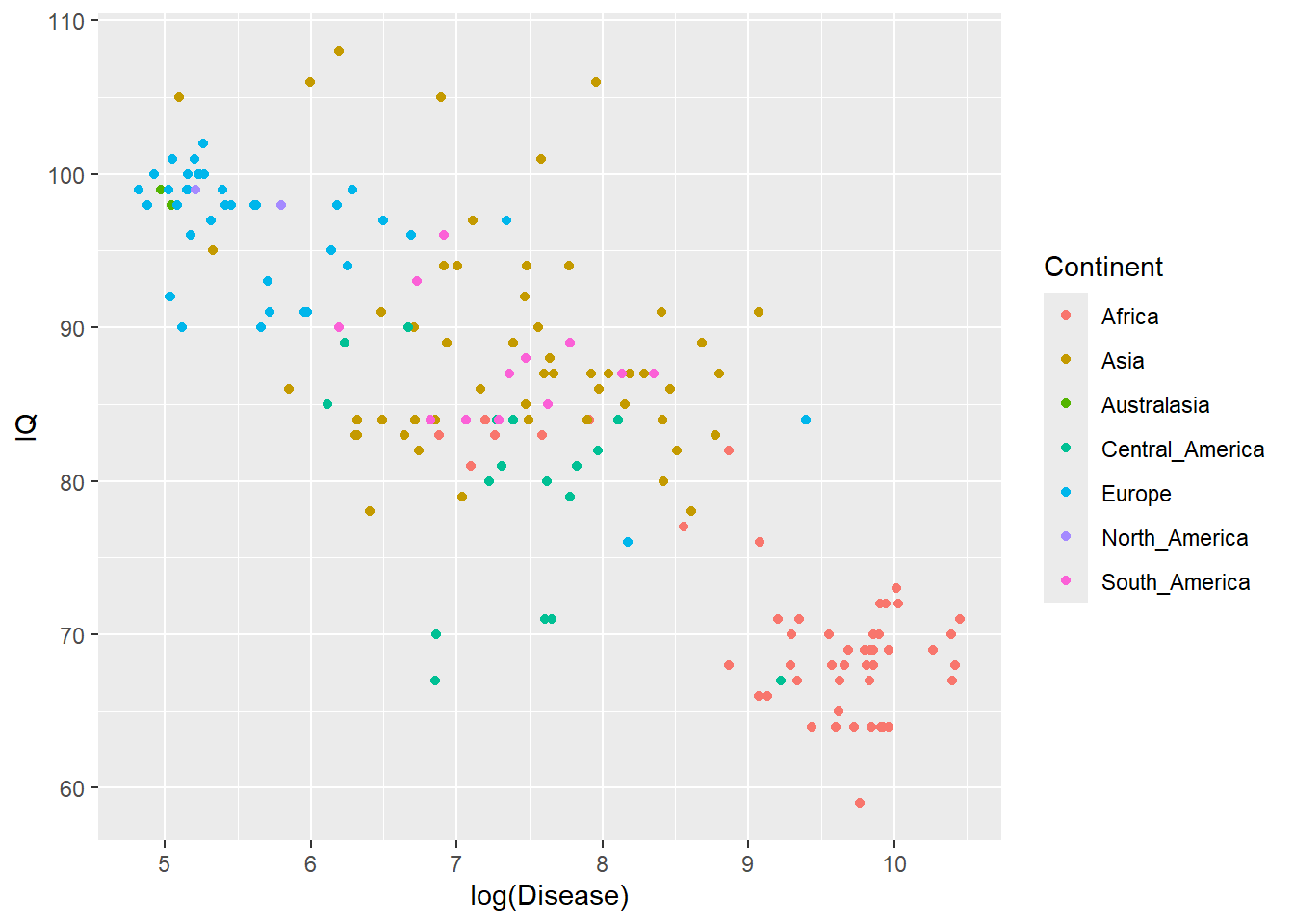 Another way to visualise why there is a autocorrelation problem, is to plot IQ and disease according to the continent of the country (similar to Figure 1 from Hassall and Sherratt, 2011):