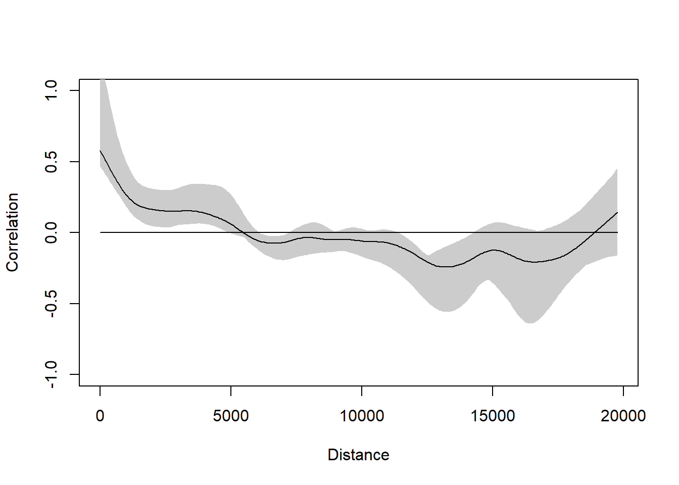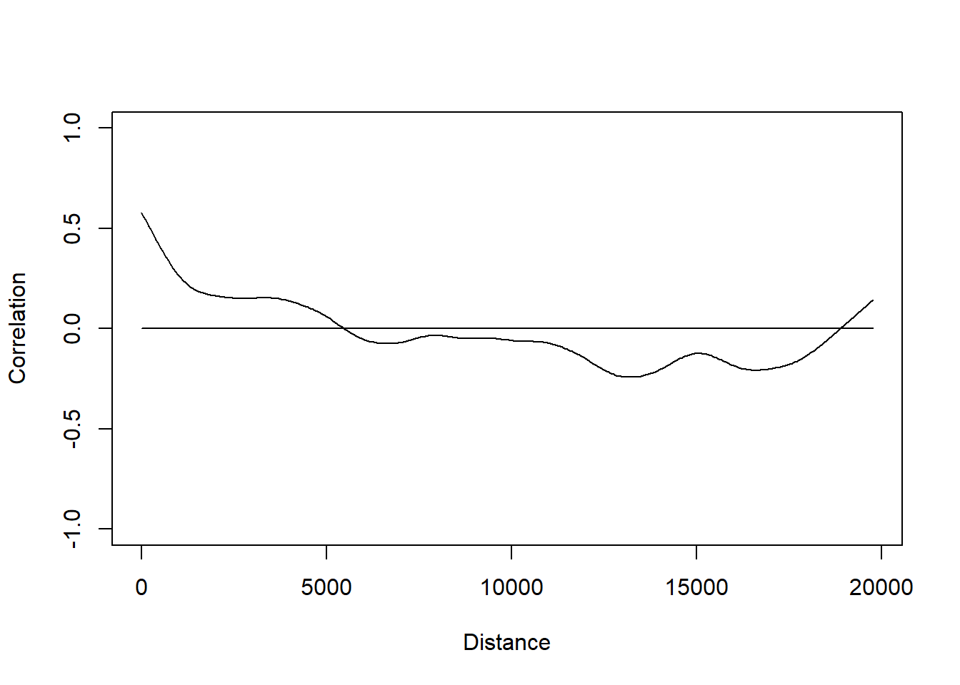 We can use the function spline.correlog() in the package ncf to create a correlogram. This helps us decide if we have autocorrelation.